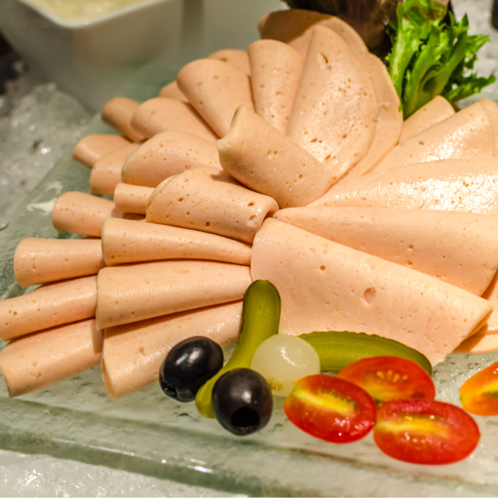 Hähnchenfleisch 80 %, Pflanzenfett (Rapsöl), Trinkwasser, Gewürze, Nitritpökelsalz (Speisesalz u. Konservierungsstoffe E250, E500, E535), Phosphat E451, Antioxidationsmittel E301, Geschmacksverstärker E621. Allergene: Sellerie.