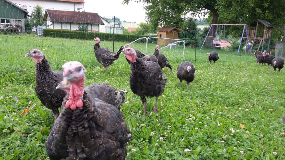 Als Rückzugsort dient ihn unser bodennaher Mobilstall. Gefüttert wird mit regionalen Produkten die gentechnikfrei produziert werden. Diese Haltung ist die Grundlage für eine magere und gleichzeitig saftige Fleischqualität.
